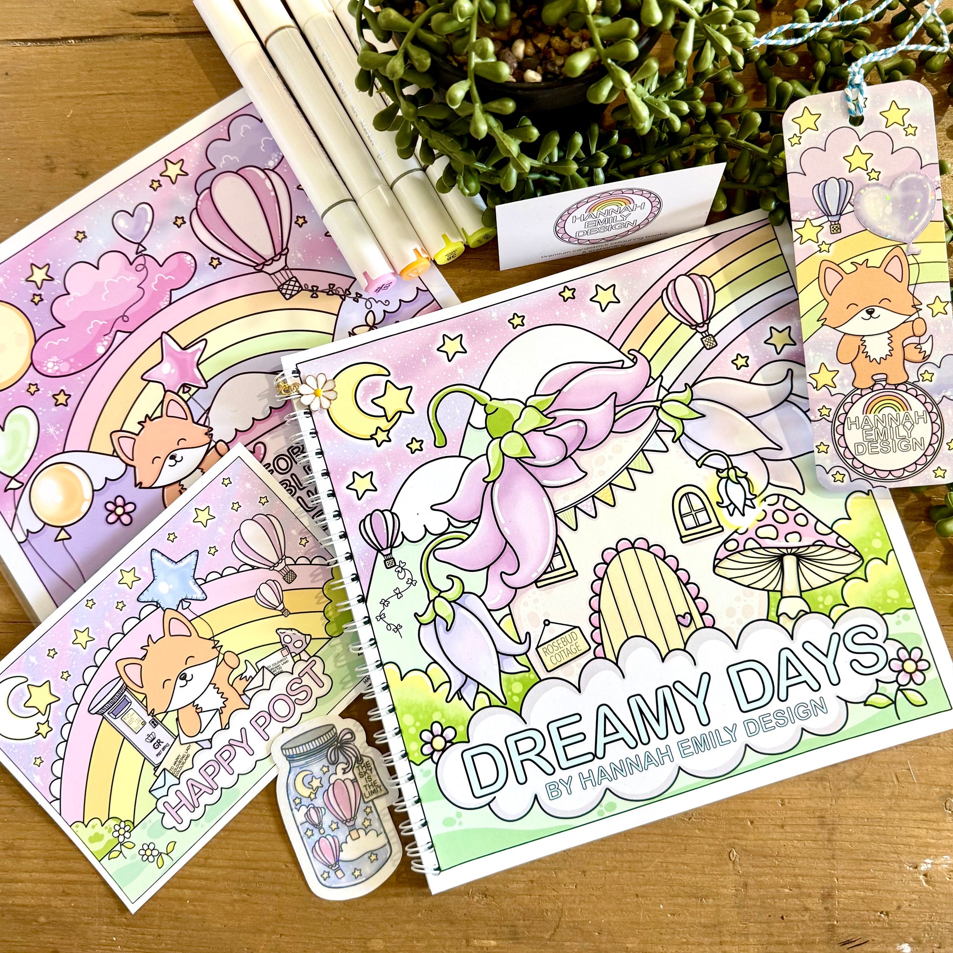 Included with every colouring book is a hand drawn bleed through sheet, book mark, sticker, postcard and cute pencil.